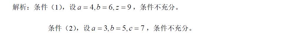 由條件(2),得a,b,c的數為3、5、7;那么|a-b-c|+|b-c-a|-|c-a-b|=-(a-b-c)-(b-c-a)+(c-a-b)=3c-a-b。所以條件(2)也充分。