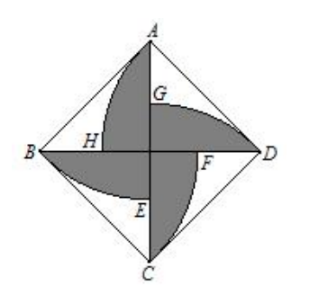 那么陰影部分的面積為 $S_{\text {陰 }}=4 \cdot\left(S_{\overline{A D H}}-S_{\triangle A O D}\right)=4 \cdot\left(\frac{1}{8} \pi \cdot 1^2-\frac{1}{2} \times \frac{\sqrt{2}}{2} \times \frac{\sqrt{2}}{2}\right)=\frac{\pi}{2}-1$ 。