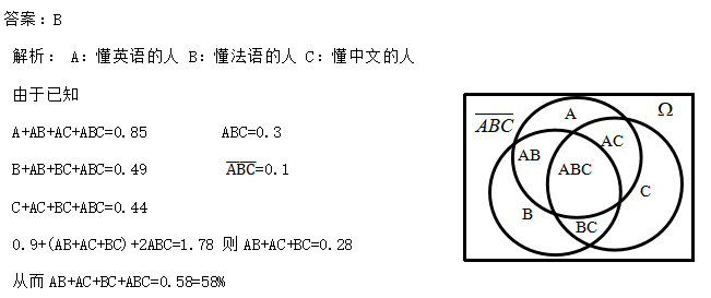 某國際會議參加人員中,有85%的人懂英文,49%的人懂法文,44%的人懂中文,三種語言都懂的有30%,三種語言都不懂的有10%,則懂兩種或兩種以上語言的人數為( )。
