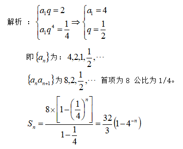 $\lbrace a _ { n } \rbrace 為等比數列,a _ { 2 } = 2 , a _ { 5 } = \frac { 1 } { 4 }$ 則 $ a _ { 1 } a _ { 2 } + a _ { 2 } a _ { 3 } + \cdots + a _ { n } a _ { n + 1 } =( )$