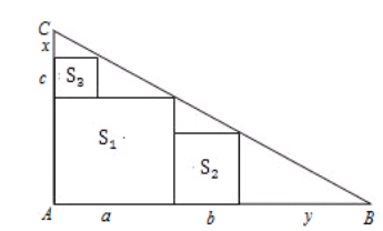 則有$\frac { c } { x } = \frac { a - c } { c } , \frac { b } { a - b } = \frac { y } { b } , $ 且 $\frac { c } { x } = \frac { y } { b } $ 。所以有$\frac { a - c } { c } = \frac { b } { a - b } \Rightarrow a = b + c $。
