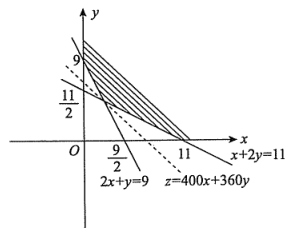 ①設(shè)甲、乙兩種貨車分別租用$x,y$輛,總費用為$z$,則$\left\lbrace\begin{array}{l} { 4 0 x + 2 0 y \geq 1 8 0 } \\ { 10x + 20 y \geq 1 10 } \\ { z = 4 0 0 x + 3 6 0 y } \end{array}\right.\Rightarrow \left\lbrace\begin{array}{l} { 2 x + y \geq 9 } \\ { x + 2 y \geq 1 1 } \\ { z = 4 0 0 x + 3 6 0 y } \end{array}\right.$